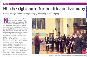 Recently I was able to indulge my interest in vocal music as I researched and wrote an article about the popularity of choral singing in Ireland for Senior Times magazine. I spoke to quite a few choirs and was inspired by their enthusiasm and obvious enjoyment of their hobby. So I’ve begun singing when I’m on my own out in the fields on our farm – but don’t tell anyone! Maybe one day I might be fit to be heard in public…meanwhile readers in Ireland can enjoy my article in Senior Times.