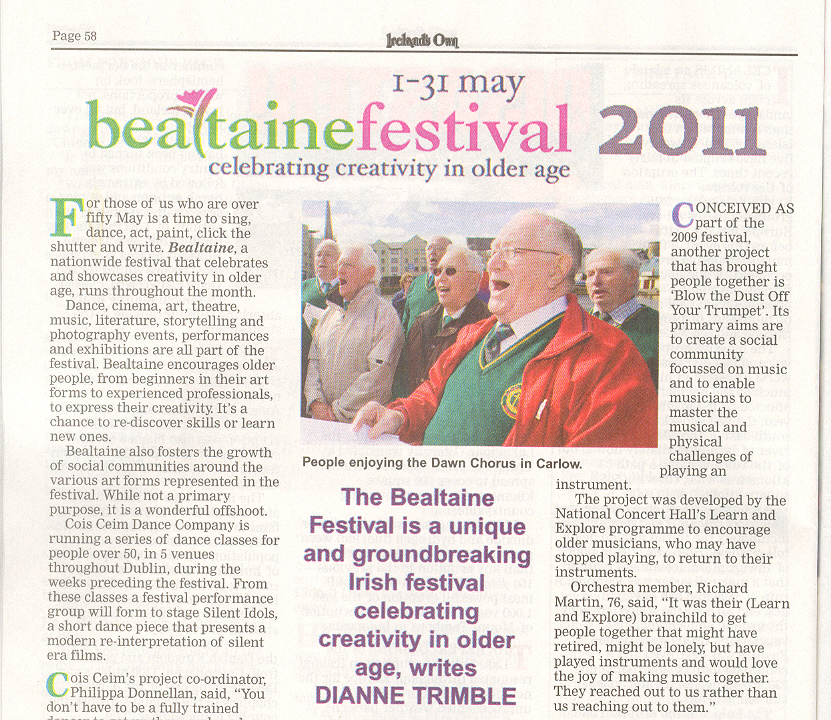 Sunday begins Ireland’s Bealtaine Festival which runs throughout May. The countrywide festival turns the spotlight on older people and the arts – celebrating our achievements and encouraging everyone in this age group to get involved and unleash our creativity. In this week’s Ireland’s Own magazine I had a look at the festival and what’s in store during Bealtaine 2011. For information about Bealtaine 2011, see the festival website: Bealtaine Festival.