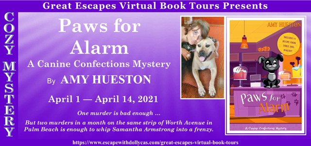 Today Amy Hueston is visiting Ascroft, eh? to tell us about Paws for Alarm, her latest novel in the Caninie Confections mystery series.