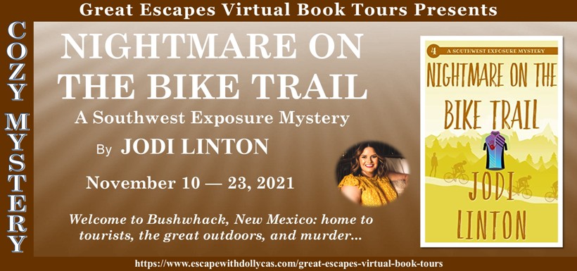 Today Jodi Linton is visiting Ascroft, eh? to tell us about Nightmare on the Bike Trail, her latest novel in the Southwest Exposure Mystery series.