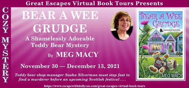 Today Meg Macy is visiting Ascroft, eh? to tell us about Bear A Wee Grudge, her latest novel in the Shamelessly Adorable Teddy Bear Cozy Mystery series.