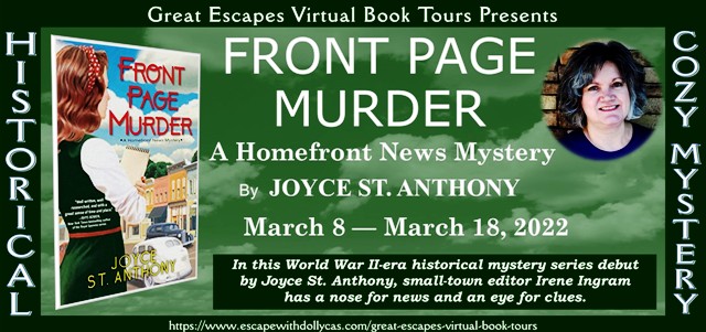 About Joyce St Anthony: Joyce was a police secretary for ten years and more than once envisioned the demise of certain co-workers, but settled on writing as a way to keep herself out of jail. As Joyce St. Anthony, she is the author of the Homefront News Mysteries. The first in the series, Front Page Murder, was released on March 8, 2022. Under her own name–Joyce Tremel–she wrote the award winning Brewing Trouble cozy mystery series. She is a native Pittsburgher and lives in the beautiful Laurel Highlands of Pennsylvania with her husband and two cats–Hops and Lager.