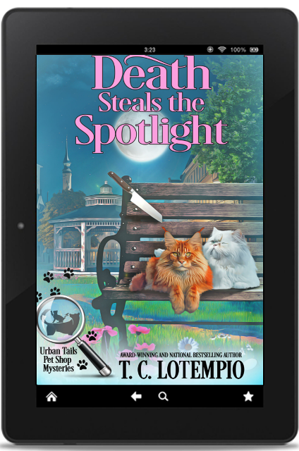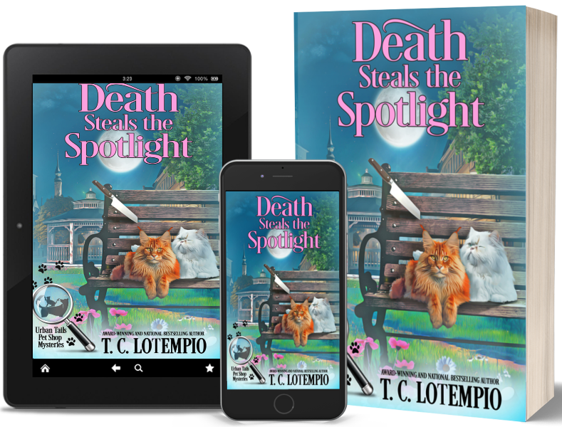 About T.C. Lotempio: While Toni Lotempio does not commit – or solve – murders in real life, she has no trouble doing it on paper. Her lifelong love of mysteries began early on when she was introduced to her first Nancy Drew mystery at age 10 – The Secret in the Old Attic.  She and her cat pen the Nick and Nora mystery series originally from Berkley Prime Crime and now with Beyond the Page Publishing.  They also write the Cat Rescue series from Crooked Lane and the Pet Shop series, originally published by Midnight Ink and rebranded last  year as “Urban Tails Pet Shop Mysteries.”  Number three in this series debuted June 27, DEATH STEALS THE SPOTLIGHT. Recent other releases include Book six in the Nick and Nora mysteries, A PURR BEFORE DYING, and book one in the new Tiffany Austin Food blogger series, EAT, DRINK AND DROP DEAD.