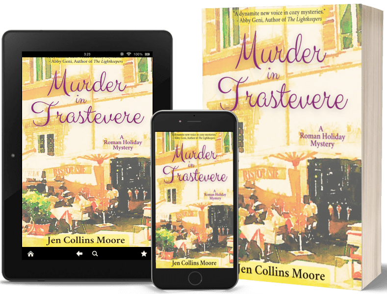 About Jen Collins Moore: Jen transports readers to Rome in the Roman Holiday Mysteries. Her short fiction has appeared in Mystery Weekly and Masthead: The Best New England Crime Stories. She is president of Sisters in Crime Chicagoland and a founding member of Sleuths and Sidekicks. A transplanted New Englander, she lives in Chicago with her husband and two boys.