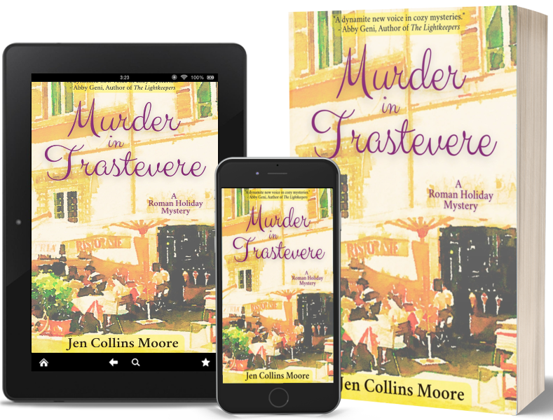 About Jen Collins Moore: Jen transports readers to Rome in the Roman Holiday Mysteries. Her short fiction has appeared in Mystery Weekly and Masthead: The Best New England Crime Stories. She is president of Sisters in Crime Chicagoland and a founding member of Sleuths and Sidekicks. A transplanted New Englander, she lives in Chicago with her husband and two boys.