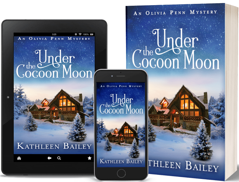 Under the Cocoon Moon depicts a small-town, cozy Christmas with a dash of mystery and murder. There’s lots of humor, romance, and holiday cheer to provide a pleasant escape to Apple Station, where the plots are twisty, the characters are charming, and justice always prevails. Under the Cocoon Moon can be read as a stand-alone with no plot spoilers for the previous books in the series. You can read more about all my books by visiting me at kathleenbaileyauthor.com.
