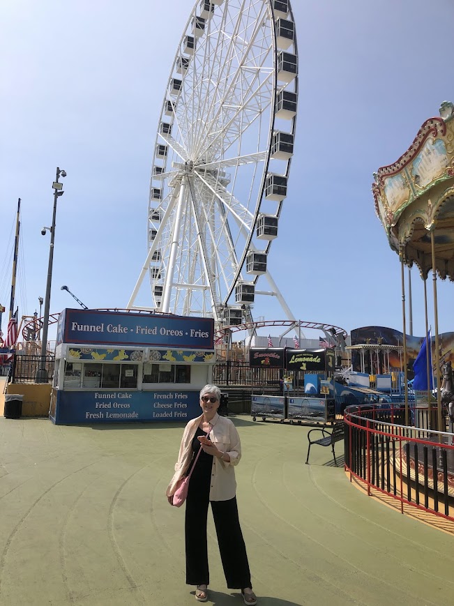I’ve had great fun going down dozens of rabbit holes in my research for the story, deliberately mixing real and fictional characters and locations. Part of that research included a trip to AC, where I visited the public library to learn about their digital archives, and of course, made a pilgrimage to the modern Steel Pier. Today’s Steel Pier is primarily rides, shore amusements, and boardwalk food. Its centerpiece is the majestic Wheel, a 227-foot structure which looks out over the Atlantic with amazing ocean views. (So I hear. Rides scare me!)