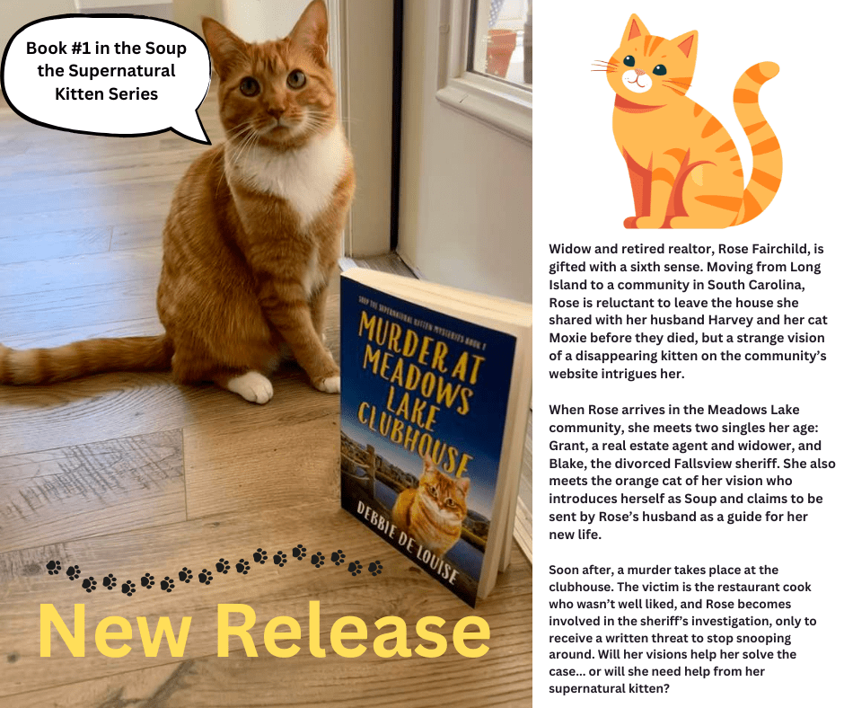 Readers can learn more about Soup and her author, Debbie De Louise by visiting the author’s website and her Facebook, Goodreads, Bookbub, Instagram, LinkedIn and Debbie’s Character’s Chat group. You can also follow her on Twitter/X.