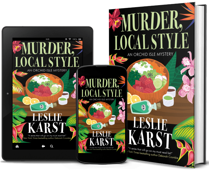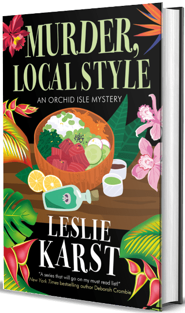 That’s how I found myself once again trying to solve a murder and exonerate the prime suspect (myself, in this case). You see, this is the third time I’ve found myself in this situation, crazy as it sounds. The first two murder investigations are recounted in the previous books in Leslie Karst’s Orchid Isle mystery series: Molten Death (involving a body—which only I witnessed—being covered over by hot, molten lava) and Waters of Destruction (in which I undertook to prove my good friend Sachiko innocent when the body of the bartender at her restaurant, the Speckled Gecko, is pulled from the dangerous Wailuku River shortly after a heated argument between her and her barkeep).